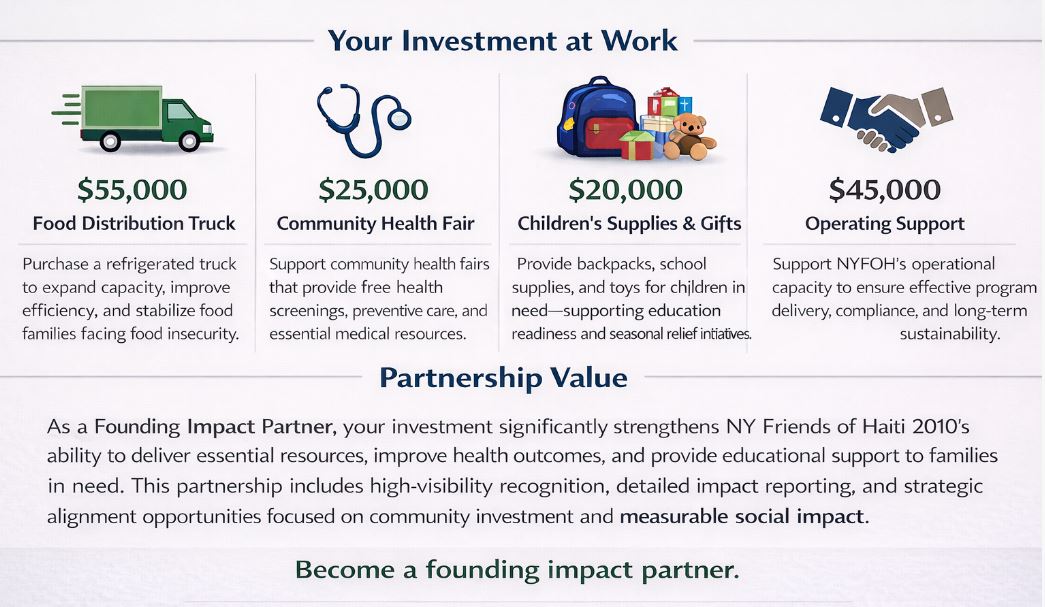NY Friends of Haiti 2010 (NYFOH) is seeking a donated or sponsored delivery truck to support our food distribution operations. A dedicated vehicle will significantly increase our ability to transport and distribute fresh, nutritious food to families facing food insecurity—improving efficiency, reliability, and reach.